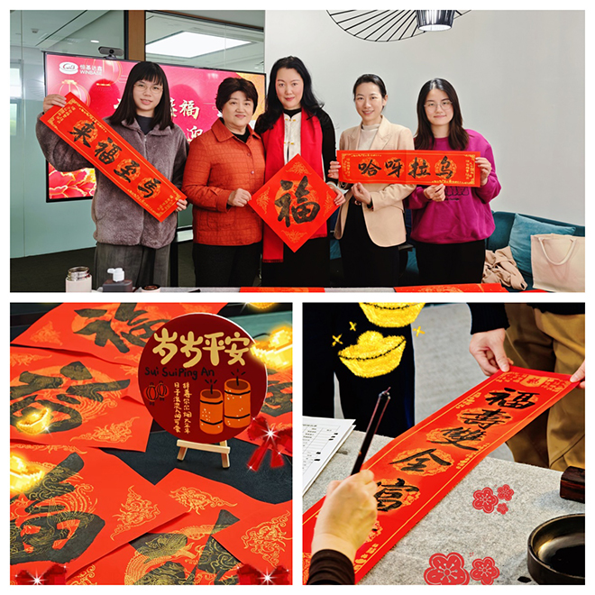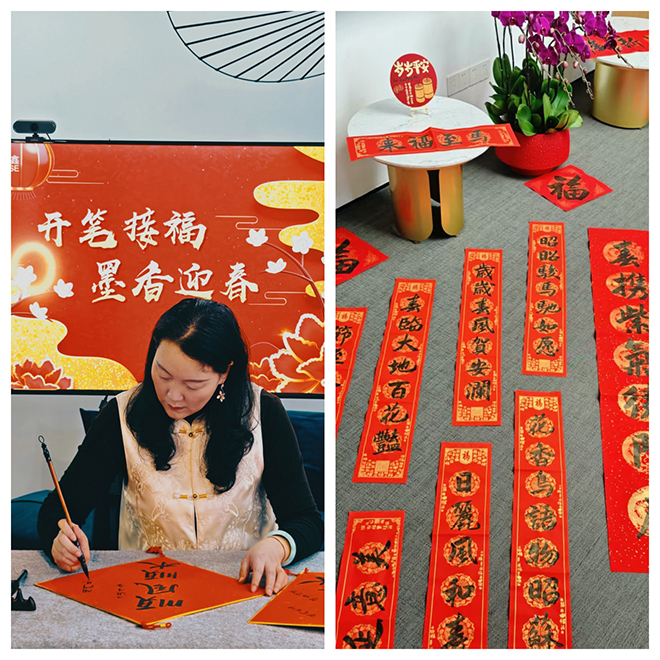 本次活动以“开笔纳福,墨香迎春”为主题,特邀珠海市书法家协会名师现场执笔,为员工书写定制春联与“福”字。一横一竖承载吉祥寓意,一撇一捺书写企业温情。活动旨在通过笔墨传递祝福,将节日祝福与企业文化相融合,在笔墨传承中增强了团队凝聚力,也让传统文化在现代职场中焕发出新的生机与温度。