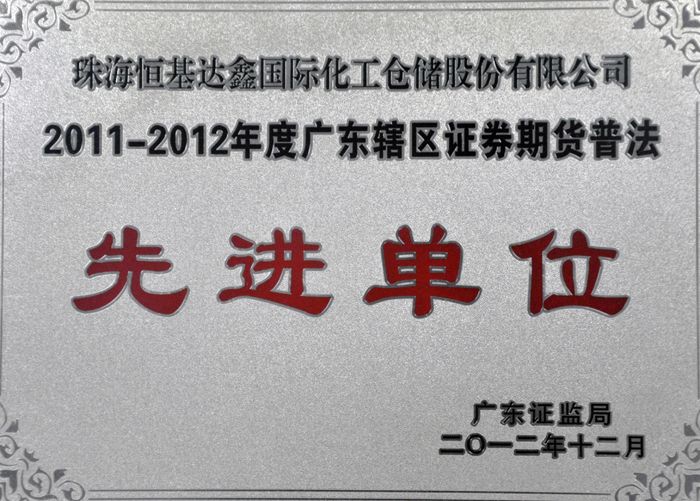 在2011-2012年法制宣传教育工作中,我司因工作突出,成绩显著,于近日荣获广东证监局颁发的“普法先进单位”荣誉称号。 自从公司上市以来,公司领导对普法工作十分重视,把普法工作列入议事日程。而在证监会《关于开展2011年“12•4”证券期货法制宣传活动通知》下达后,公司成立了以董事长王青运为组长,董事会秘书苏清卫为副组长,相关部门领导为主要成员的法制领导小组,并明确职责,形成主要领导亲自抓,分管领导具体抓,业务部门和相关部门共同抓落实的领导体制和工作机制;此外,还成立了以董事会秘书为组长的工作小组,作为普法教育的常设机构,负责普法的日常管理工作。 公司一是明确了法制宣传活动的主要内容、普法对象、宣传方法等,保证了普法工作有计划、有步骤地实施;二是举办普法知识和法制教育培训班,聘请法律专家来司举办讲座,为管理人员和员工讲解《劳动法》、《合同法》等,以增强广大员工知法、懂法、守法的意识,提高依法管理水平;三是加强公司现场及网站对“回报投资者”主题的宣传。另外,公司在《每日经济新闻》刊载文章《恒基达鑫:十年稳步发展 领跑石化物流服务》,加强对公司的宣传介绍,使投资者能够通过多种渠道了解公司,以期助于投资者对公司价值的判断。