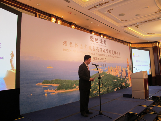 6月13日下午,珠海市委、市政府在香港举行蓝色珠海·横琴新区高端服务业投资环境推介会,向香港各界及珠三角部分企业介绍横琴开发建设最新成果。珠海市相关领导,香港特区政府机构代表、社会知名人士和在港世界500强企业代表共计约360人出席推介会。我司应邀参加此次推介会,公司董事张辛聿先生,副总经理苏清卫先生出席会议。