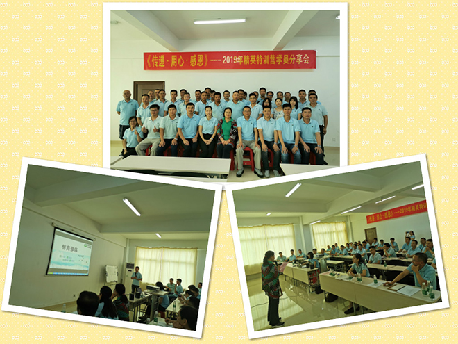 2019年8月20日上午,一场《传递·用心·感恩》-2019年精英特训营学员分享会在公司8区三楼培训室举行,公司基层以上管理人员参加了此次分享会。