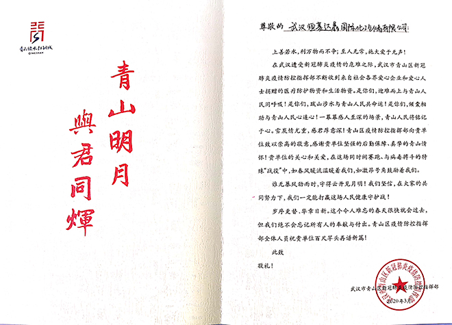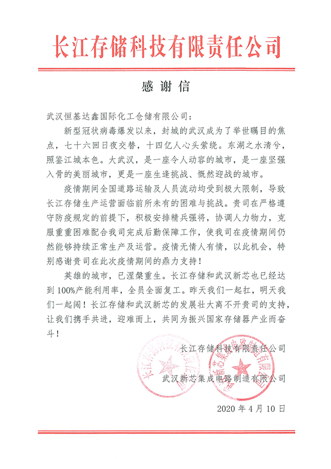 肺炎疫情无情,恒基达鑫有爱,身处重灾区的控股子公司武汉恒基达鑫在武汉抗击新冠肺炎疫情中,公司全体员工始终团结一心,坚守岗位,持续为客户提供服务,做好防控物资调拨运输保障工作,更捐赠医疗物资助力疫情防控阻击战,近期收到了武汉市青山区新冠肺炎疫情防控指挥部、长江存储及武汉新芯给武汉恒基达鑫寄来的感谢信,振奋全体恒基达鑫人的心。一封封感谢信,不仅是对武汉恒基达鑫的感谢与褒奖,更是对恒基达鑫全员逆行而上、敢于担当、善于担当的肯定与激励。这份认可和感谢对恒基达鑫人来说,格外珍贵、意义非凡!