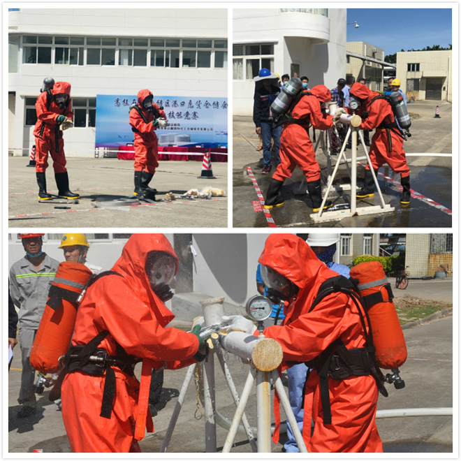 化学品泄漏为化工企业生产过程中所存在的较为常见的风险,而现场人员能否熟练使用管卡及时进行堵漏对于泄漏事故的初期处置至关重要。参赛队伍均分工明确,同时配合默契,熟练使用堵漏工具,迅速完成堵漏。虽然该项目有部分队伍堵漏失败,但这些队伍均表示从此次比赛失误中认识到了自身能力欠缺的地方,将有针对地进行改进和提升。