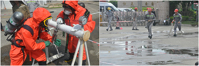 管卡堵漏项目为真正考验现场基层员工对于突发情况的应急处理能力的一个项目。参赛选手们都争分夺秒互相配合穿戴好防化服、空气呼吸器等基本防护装备,携带堵漏工具赶至堵漏点堵漏,操作熟练,动作敏捷,成功在规定时间内完成堵漏。