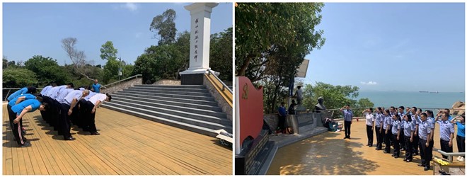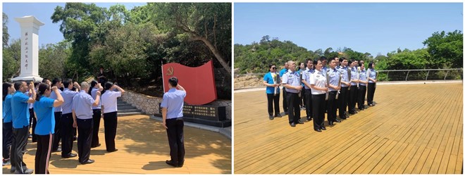 上午10点,大家乘船抵达桂山岛红色教育基地“桂山舰纪念公园”,在桂山舰烈士纪念碑前,全体党员举行了鞠躬敬礼、献花等仪式,表达对革命先烈的深切缅怀和无限敬仰。其后,全体党员现场学习了革命先烈在万山海战中以弱胜强、以少胜多的英勇事迹和革命历史。面向鲜艳的党旗和林文虎、郭庆隆英烈雕塑,在高栏边检处党支部书记马德平的带领下,全体党员高举右手重温入党誓词,深化作为一名共产党员的责任感和使命感,铿锵有力的宣誓声将誓词印在每一名共产党员的脑海中。
