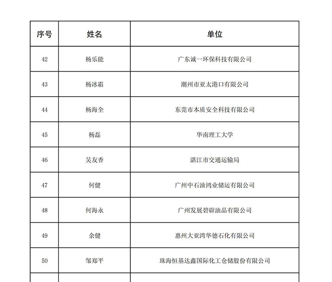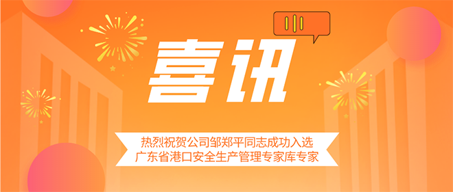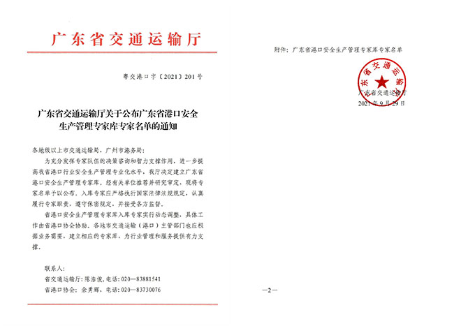2021年9月29日,从广东省交通运输厅传来喜讯,经推荐、研究审定,省厅确定了广东省港口安全生产管理专家库成员共100名,我公司副总经理邹郑平同志成功入选广东省港口安全生产管理专家库专家。