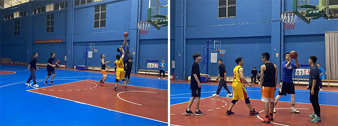与此同时,篮球比赛也正在激烈的展开。球员们默契的配合、漂亮的抢断、灵敏的过人、三分线外的远投、栏下灵活的扑救,都构成了一幅幅扣人心弦的画面;他们用激情传达着对运动的敬畏,用汗水映照着对体育的热爱,团结拼搏的精神感染了在场的每一个人。