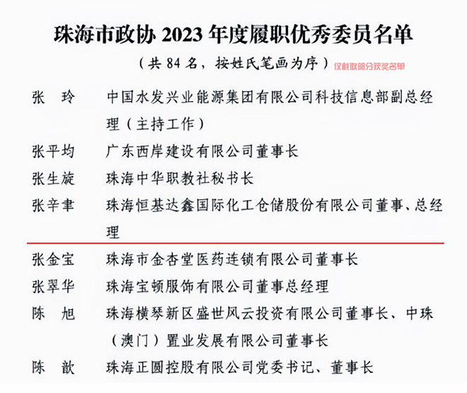 会上,公布了2023年度优秀提案和提案办理先进单位,26件优秀提案、12个提案办理先进单位和15名提案办理先进个人得到表彰。珠海恒基达鑫国际化工仓储股份有限公司董事总经理张辛聿先生获评“2023年履职考核优秀委员”,其提案获评为“珠海市政协2023年度优秀提案”。