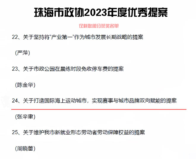 同时,他提出《关于打造国际海上运动城市,实现赛事与城市品牌双向赋能的提案》备受关注。该提案紧密围绕国家和地方发展战略,以“旅游+体育”为核心,旨在打造具有国际影响力的海上运动城市,促进城市与赛事共同发展。因其前瞻性和创新性,荣获“珠海市政协2023年度优秀提案”荣誉称号。
