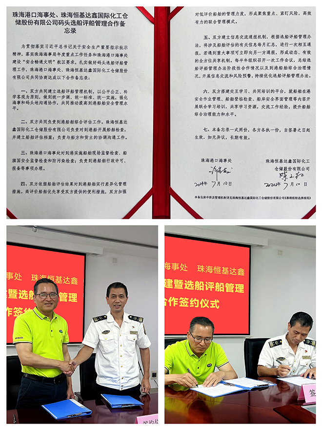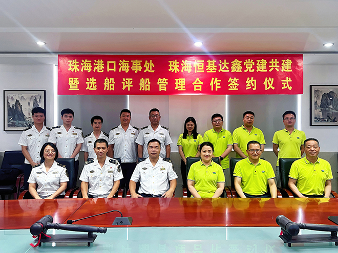 为贯彻落实习近平总书记关于安全生产重要指示批示精神,积极响应珠海海事局年度重点工作任务和珠海港口海事处建设“安全畅通文明”航区要求。7月11日,珠海港口海事处与珠海恒基达鑫国际化工仓储股份有限公司举办党建共建及选船评船管理合作签约仪式,我司成为珠海海事局辖区内首家建立了选船评船管理机制的民营企业。
