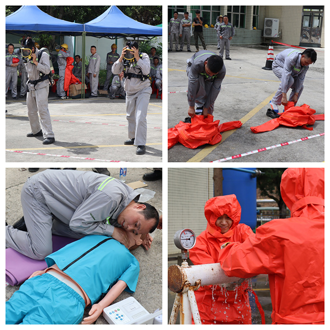 本次大赛集结生产技术部、安全环保部等5支代表队共62名精英骨干,各队至少参与两个竞赛项目,充分彰显对安全生产工作的高度重视。比赛现场,空气呼吸器穿戴、防化服穿戴、心肺复苏、管卡堵漏四大项目轮番展开,选手们凭借扎实的技能储备与冷静的临场应变,上演了一场场精彩对决。